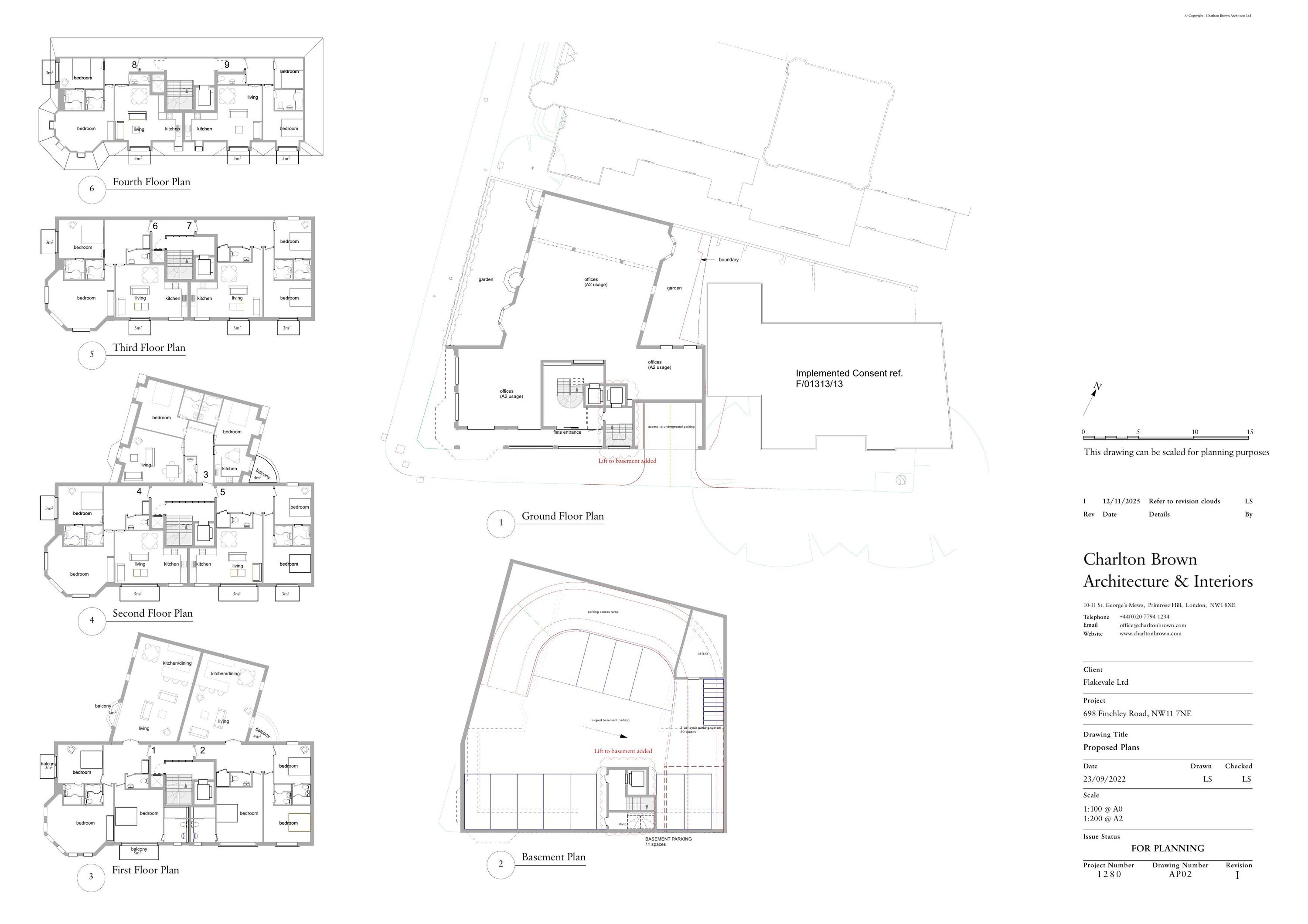 Phased development for the demolition of the existing building and erection of a part single, part two and part five storey building comprising of office space at ground floor level with 9no. self-contained flats (comprising of 7x 2 bed & 2 x 3 bed units) on the upper floors; and 11 car parking spaces at basement level accessed via Hoop Lane associated amenity space, refuse storage and cycle parking