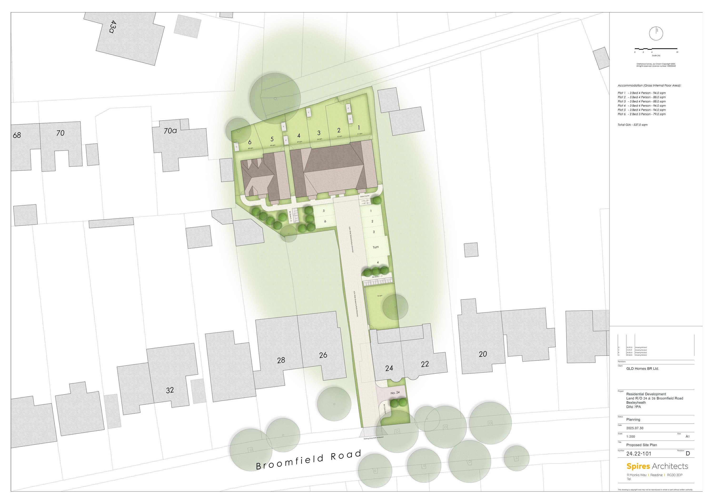 Erection of six residential dwellings, together with associated landscaping, access arrangements, refuse and cycle storage facilities, and vehicle parking, following the demolition of the existing side extensions at 24 Broomfield Road.