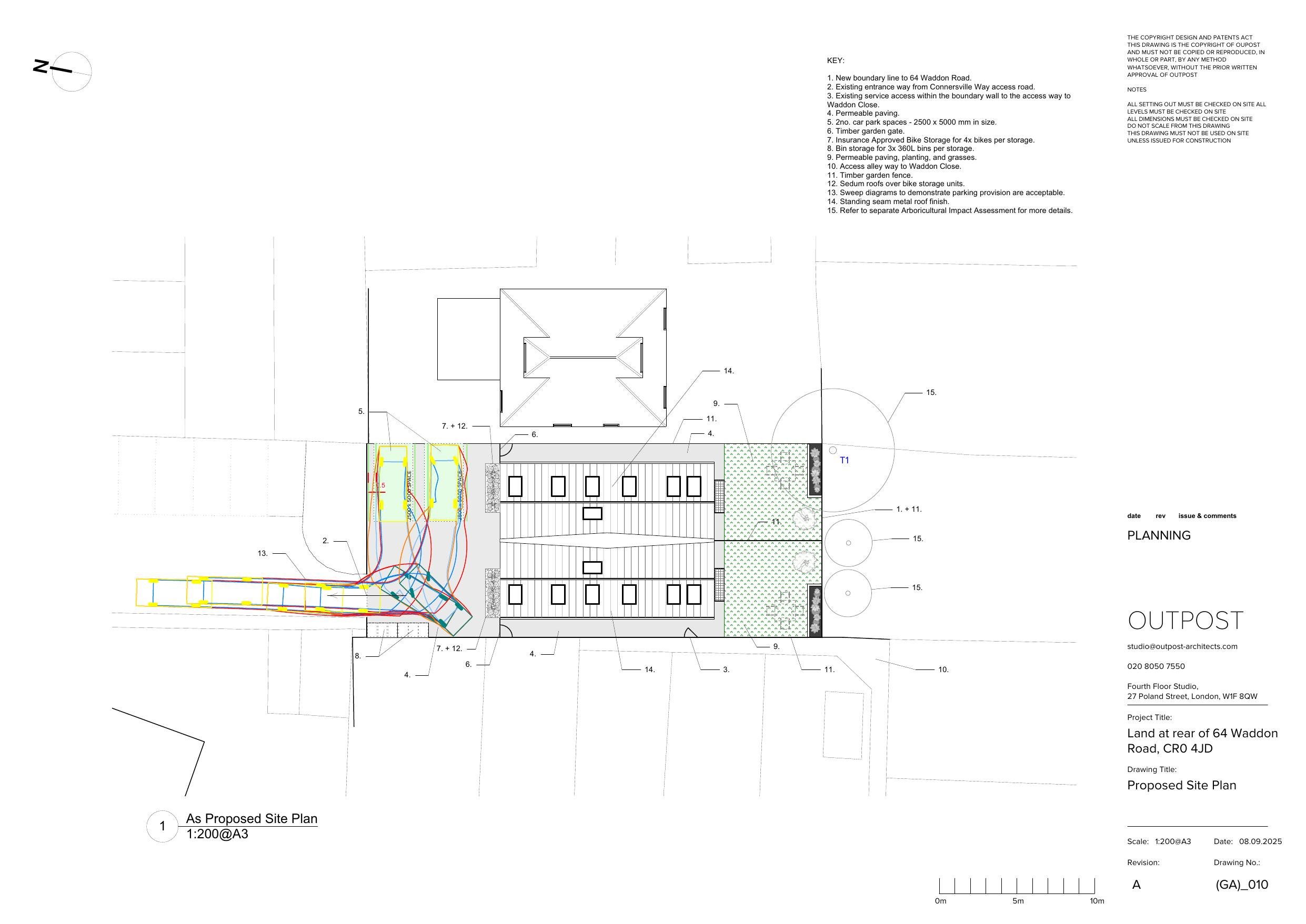 Two new three-bedroom dwellings with access, car parking, cycle and refuse storage, landscaping.