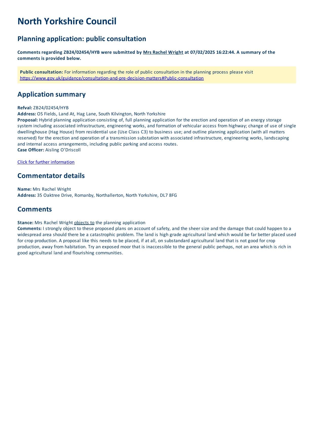 OBJECTS - "We object to a substantial industrial installation on good productive agricultural land in a beautif..."
