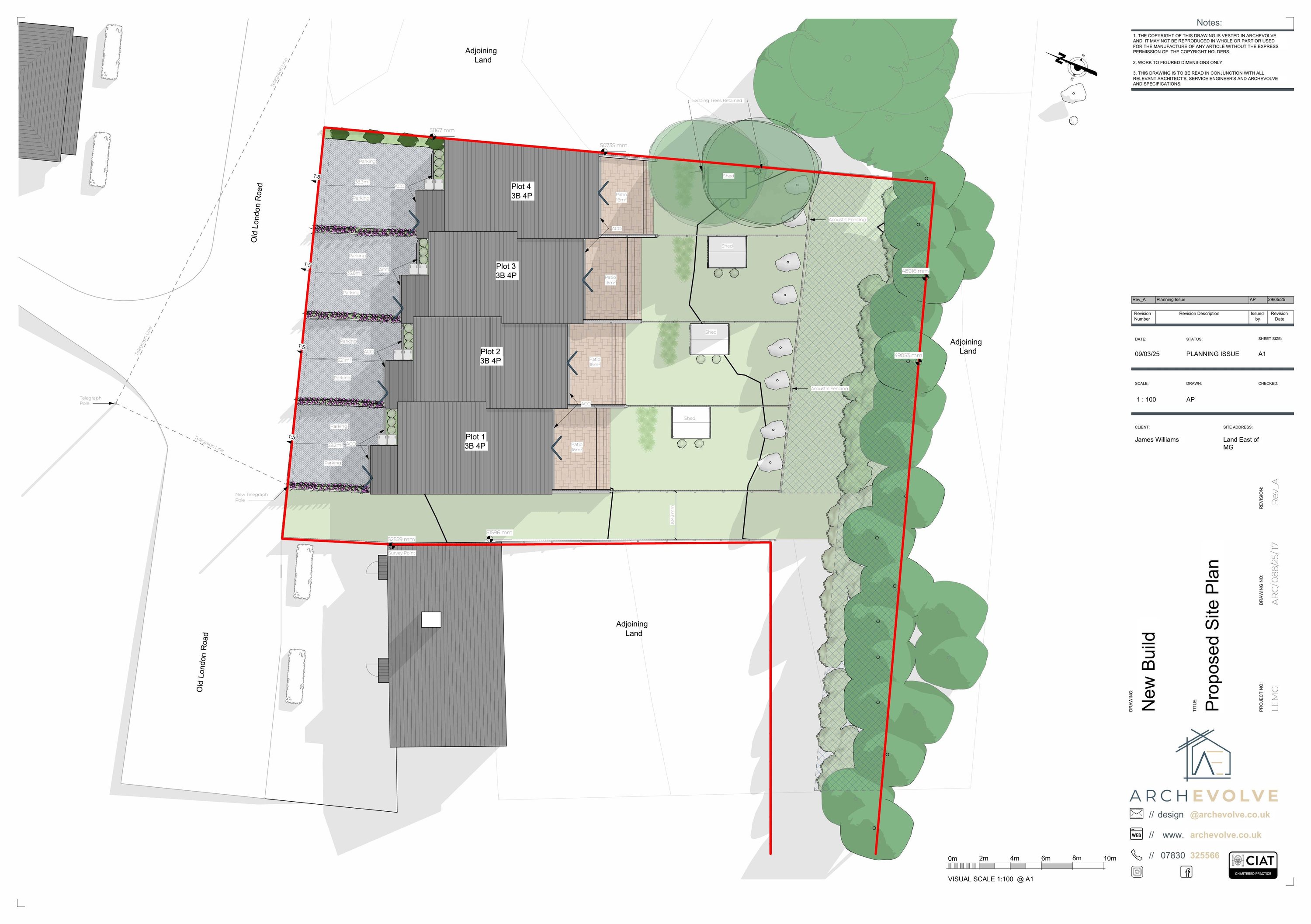 Erection of four 3-bedroom dwellings with parking, private amenity space and acoustic fencing.