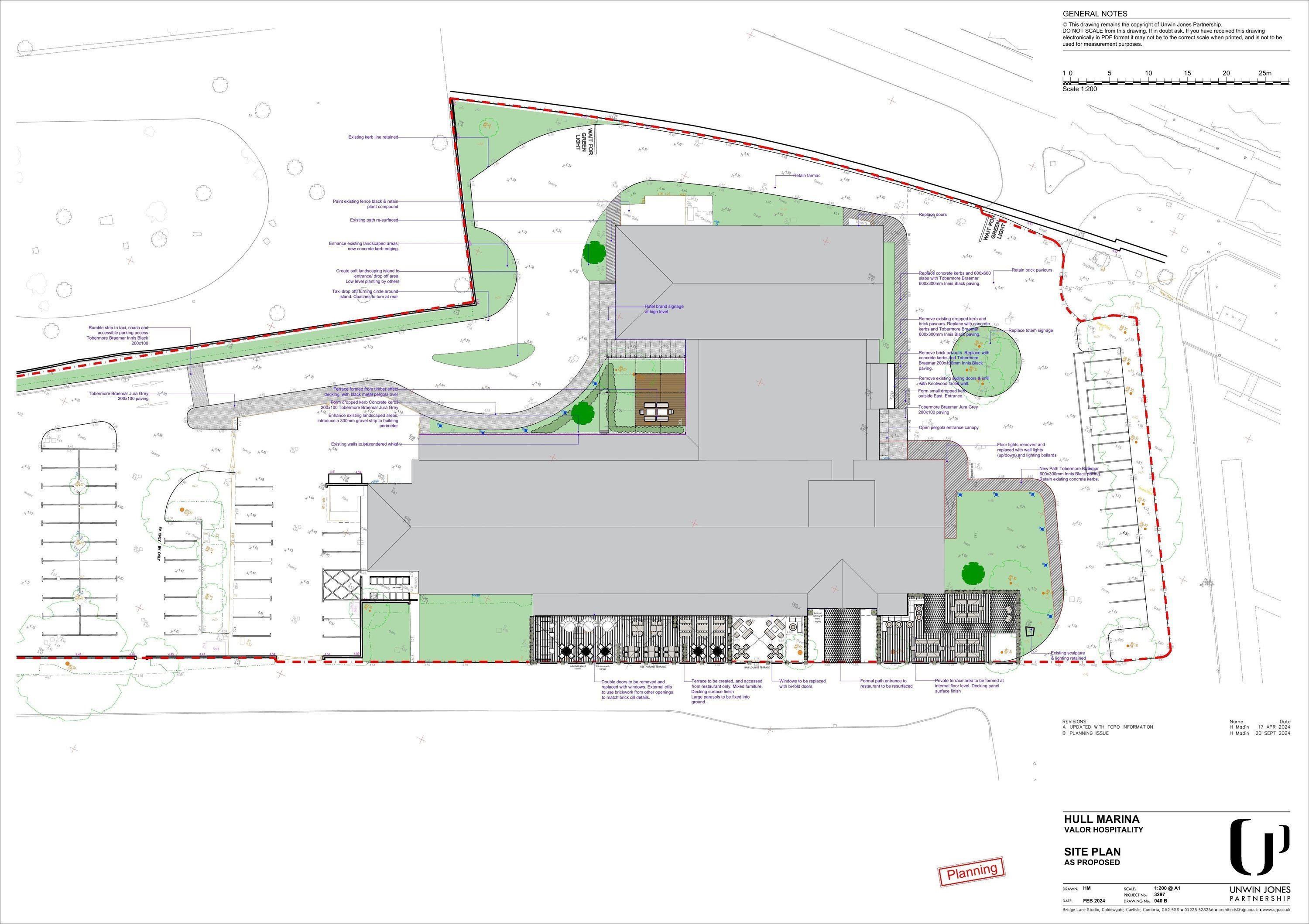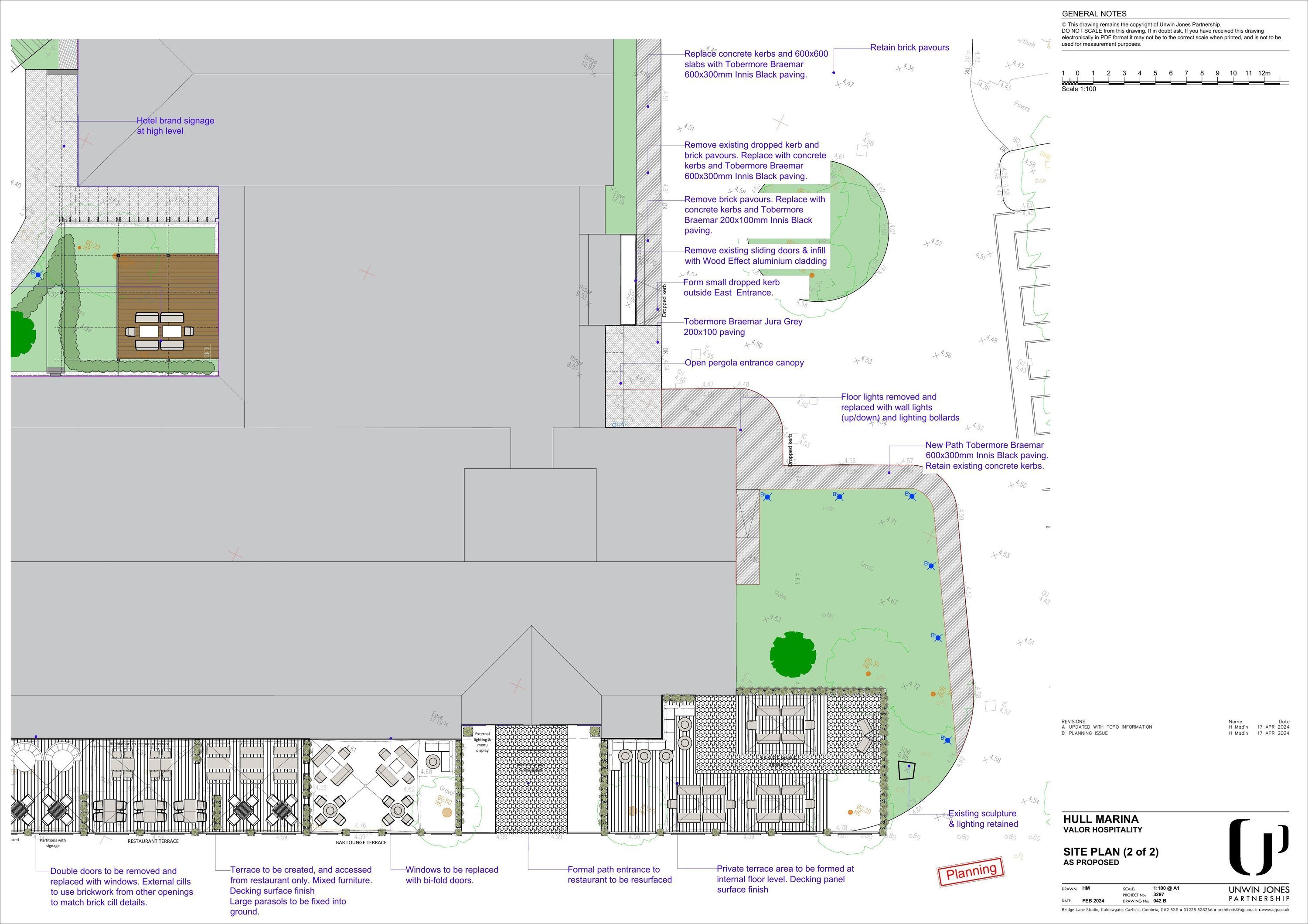 1. Form new entrance to hotel, including demolition of existing roof overhang and installation of new flat roof and timber-effect fins. 2. New private courtyard with pergola and timber terrace. 3. New and replacement bar/restaurant terrace to south side, including decking and fixed parasols. 4. Elevational alterations, including replacement windows, doors and balcony balustrades, new cladding and render. 5. Hard and soft landscaping works.