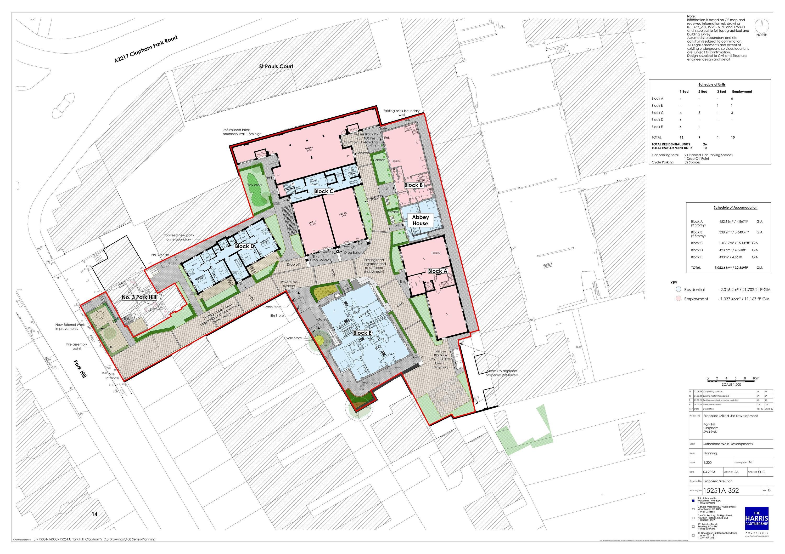 Mixed-use redevelopment comprising : Block A = Demolition of the building and erection of a 3 storey building to provide 6 commercial units of 452.1sqm (Use Class E(g)); Block B = Refurbishment of the 228.1sqm commercial building involving the erection of a roof extension and retention of Abbey House (Use Class C3); Block C = Demolition of the building and erection of 5 storey mixed use building to provide 3 commercial units of 357.2sqm (Use Class E(g)) at ground floor and 12 residential units (Use Class C3) on the upper floors; Block D = Erection of 3 storey building to provide 6 x 1 bed residential units (Use Class C3); Block E = Refurbishment/retention of the building with 7 residential units, including the installation of an external staircase to side elevation; making a total of 10 x employment units and 18 x residential units (including 8 x Affordable Units), along with landscaping and boundary treatment, access, the provision of 2 disabled parking spaces, a play area, refuse/cycle storage and other associated works.
