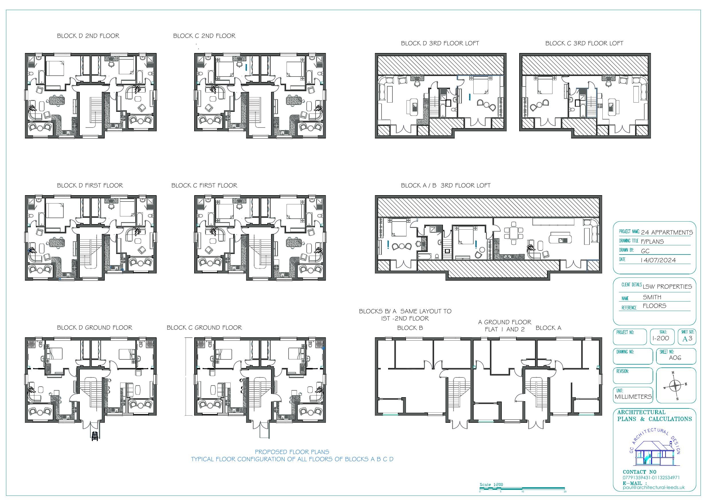 FLAT LAYOUT FLOOR PLANS BLOCKS A/B/C/D AND PROPOSED GROUND FLOOR PLAN VIEWS BLOC