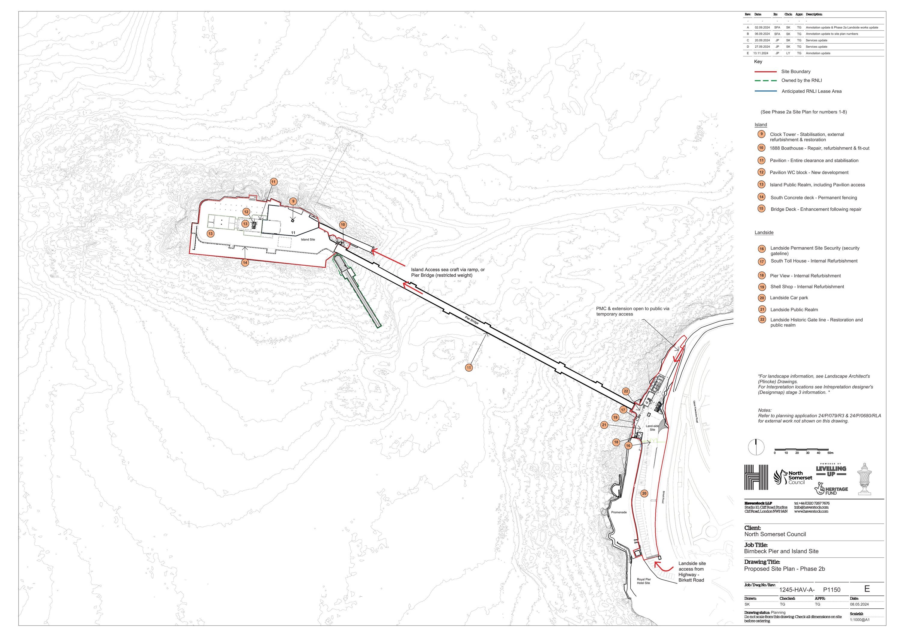 Public realm works, reinstatement of island Pavilion and installation of new toilet block within Pavilion and landside historic gate line; refurbishment of 1888 Boathouse; Change of use of South Toll House and Shell Shop for use under Class E (Commercial, Business & Service) and Class F (Local Community & Learning); installation of ramp to Pier View and associated car park rationalisation works