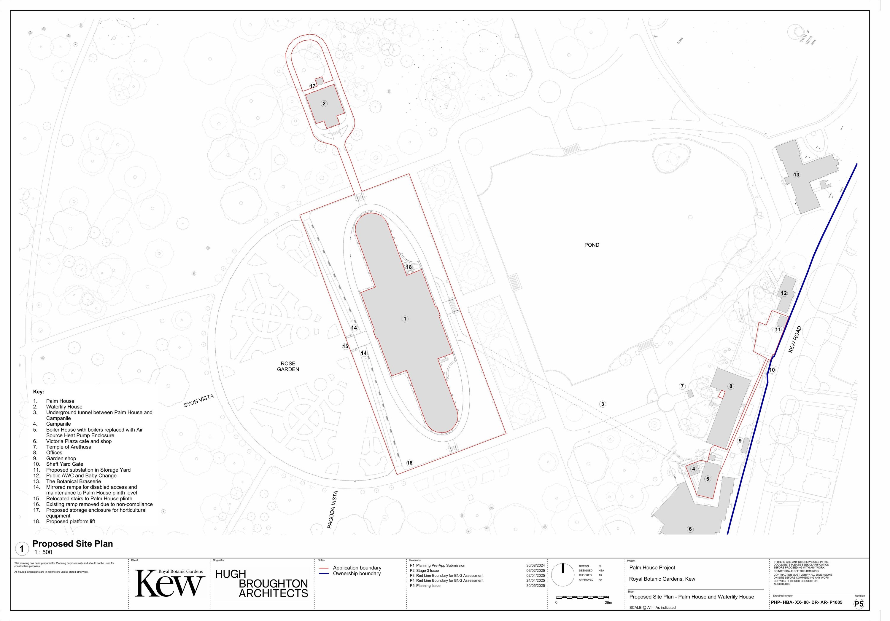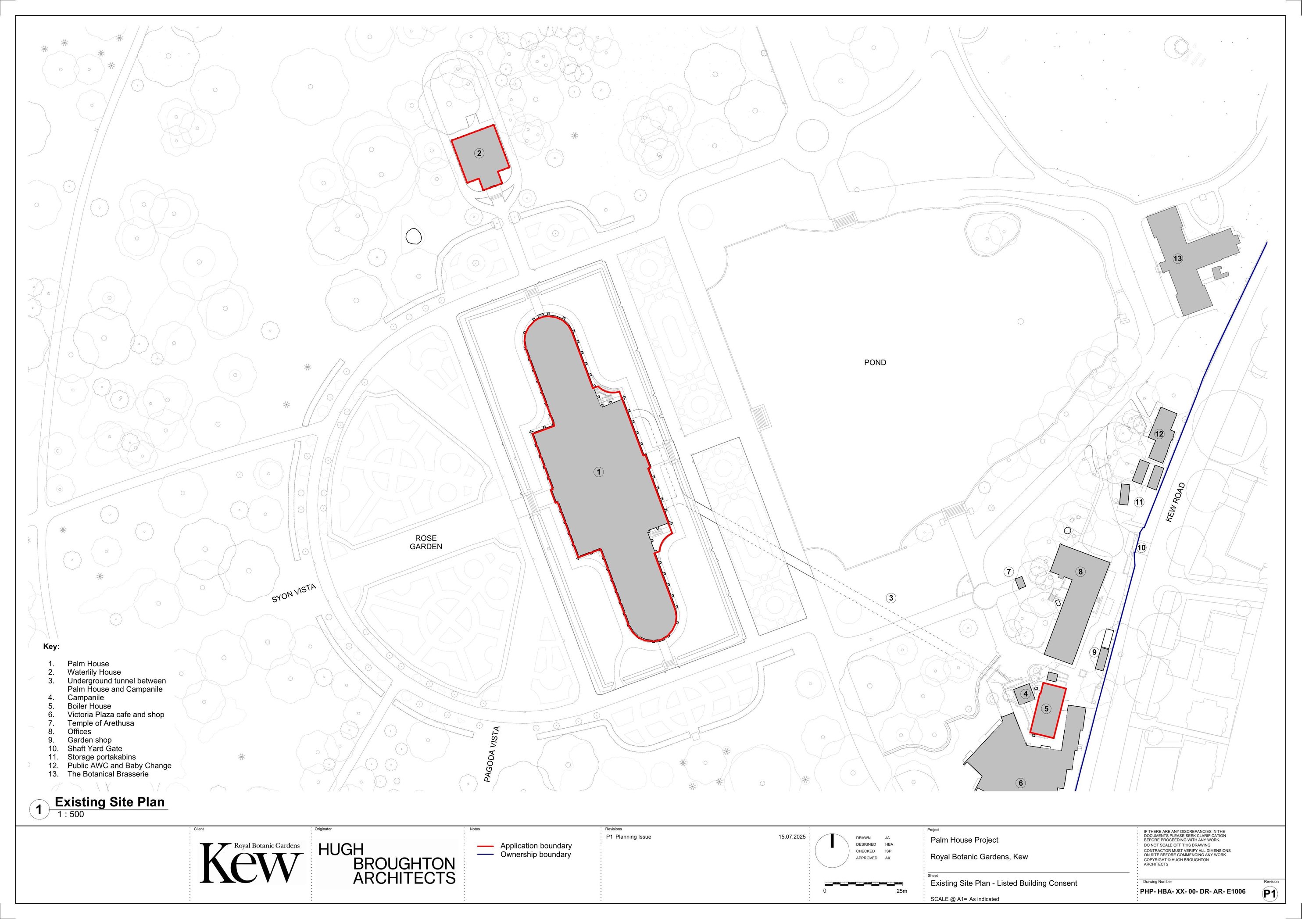 Conservation and decarbonisation of the Palm House and Waterlily House to include: • Demolition of Boiler House 13 and its replacement with a new enclosure. • Fabric conservation and upgrades to include glass replacement, repair and repainting of iron structures, reintroduction and repair of openable vents, conservation and restoration of ground level fabric (including stone, paving and grilles), and removal of the access gantry and ladder system in the Palm House. • Decarbonisation works to include installation of water source heat pumps in the Palm House basement and associated infrastructure, installation of new pipework and replacement of existing pipework, installation of new radiators in the Palm House, installation of new building management systems. • Improved access to include alterations to the ground floor layout of the Palm House and the creation of a series of interpretive and sensory installations, the installation of a ground level platform lift leading to the Palm House basement, and upgrades to entrance doors to include the removal of lobbies. • Irrigation improvements including refurbishment of rainwater harvesting tanks and the introduction of automated irrigation systems. • Other associated works and general cleaning of the glasshouses.