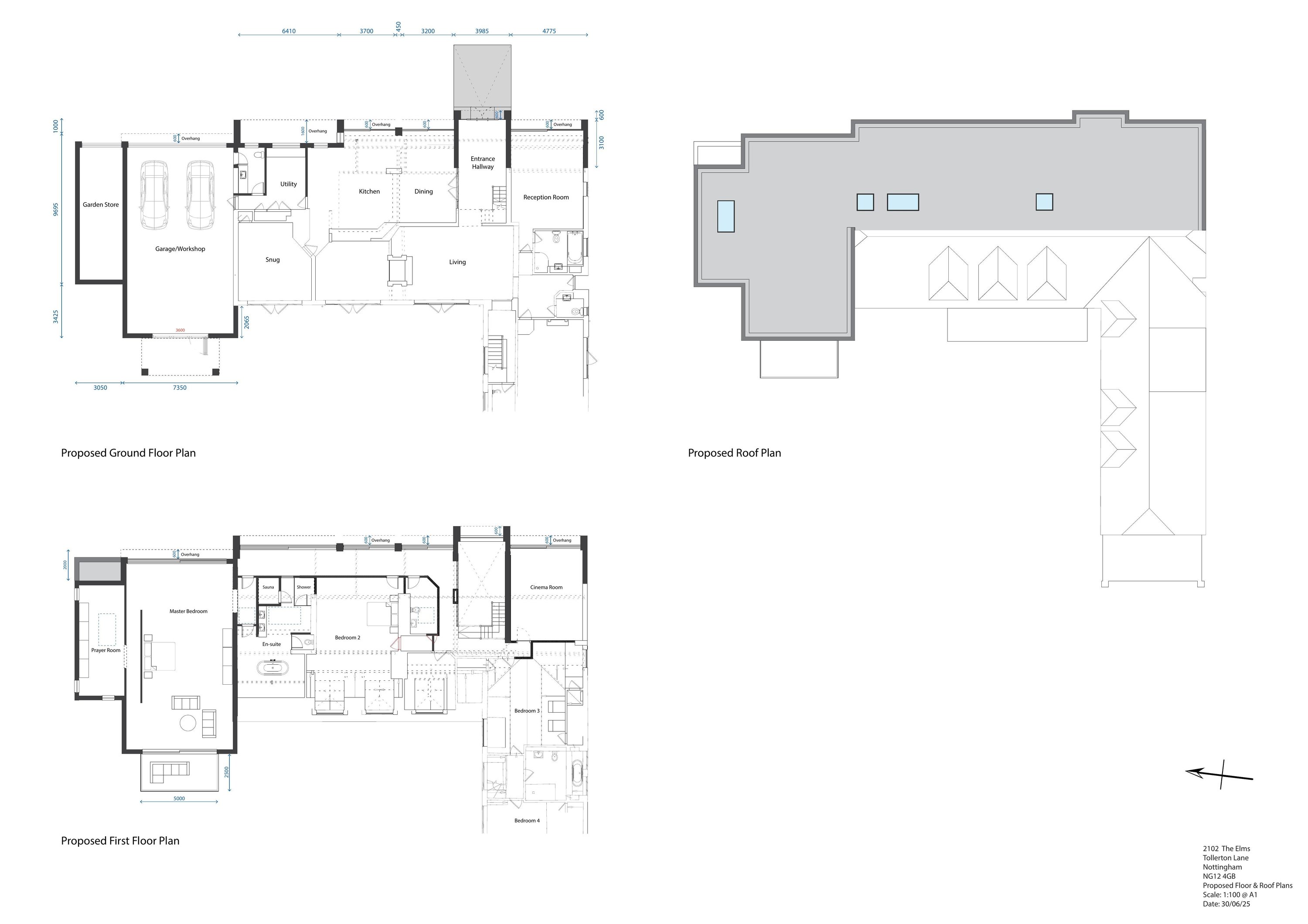 Two-storey front extension, garage conversion with two-storey link, first floor extension and rear balcony.