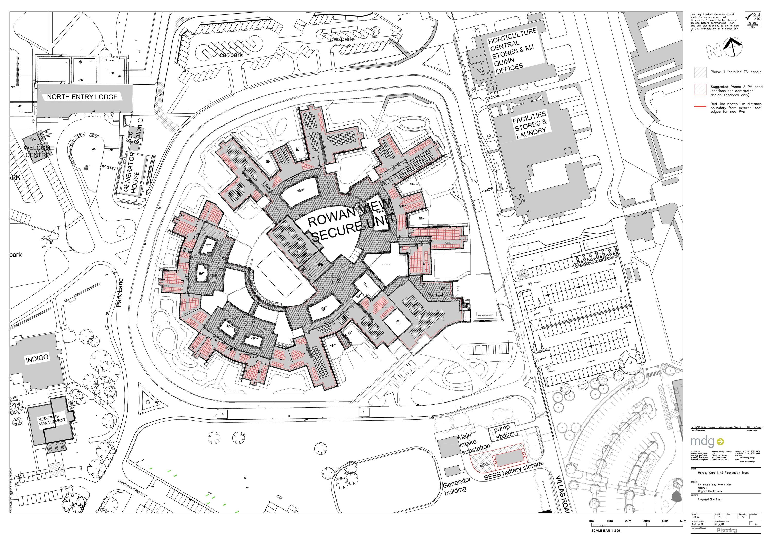 Installation of solar photovoltaics (PV) on the remaining pitched roofs of Rowan View Hospital and the erection of glass reinforced plastic enclosures to house associated battery storage and transformers.