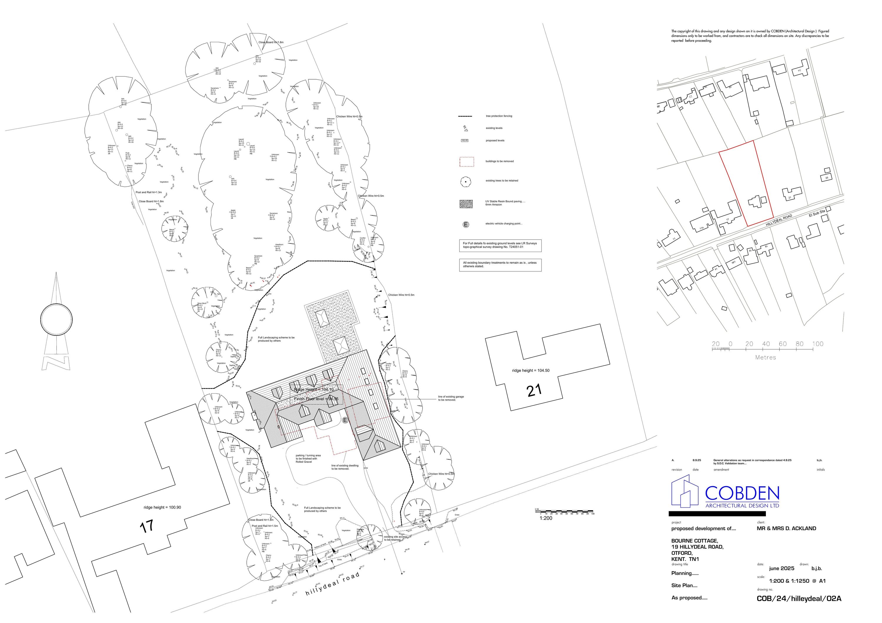 Demolition and replacement of dwelling; reconfigured parking, hardstanding removal and EV charger.