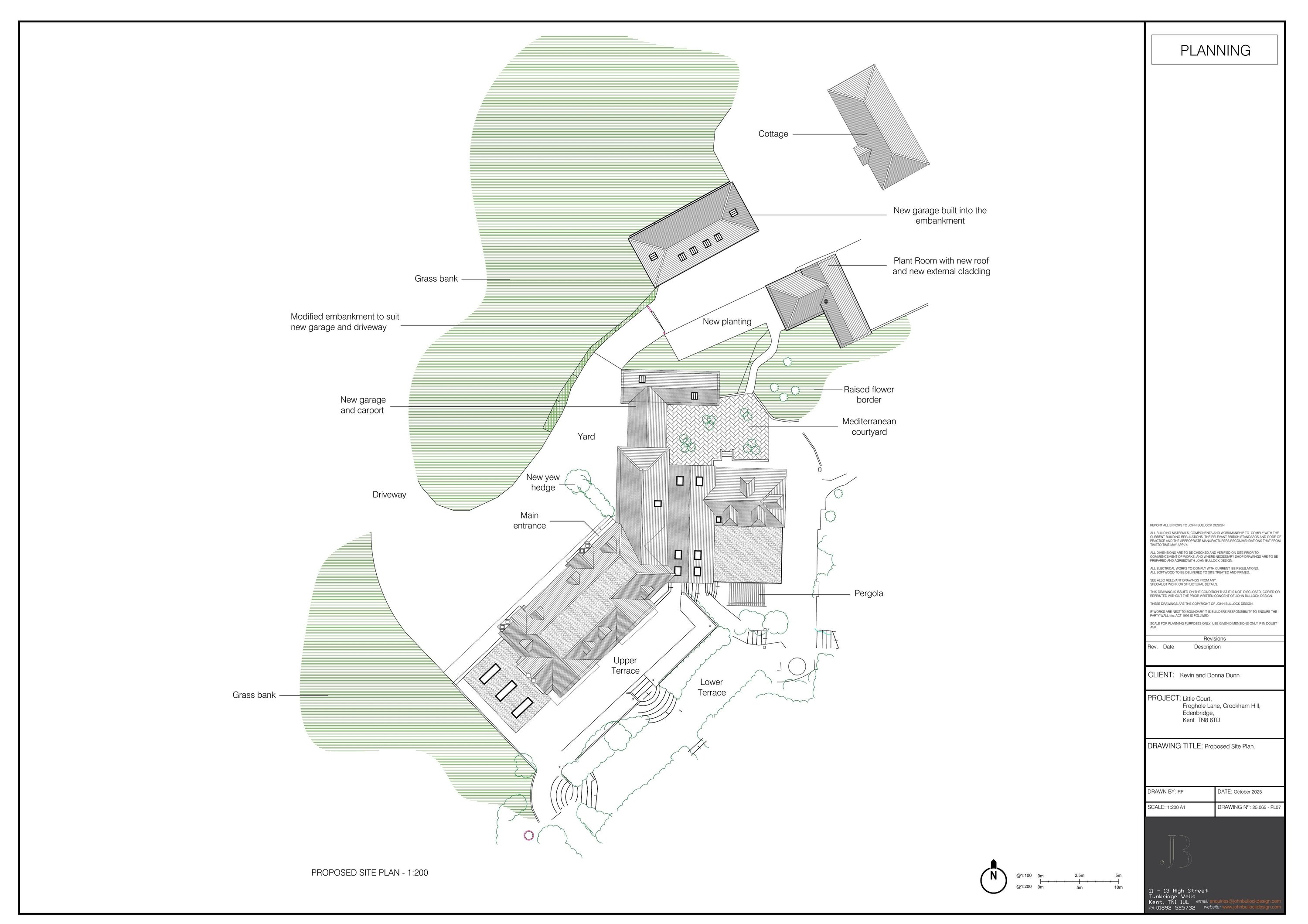 Replacement of a single storey detached plant room; Detached garage set into an existing embankment; The addition of a car port to the main dwelling; The addition of a pergola to the main dwelling; Alterations to the main dwelling including alterations to fenestration, an addition to the roof, including new gable end, removal of an existing chimney and new rooflight. Landscaping works.