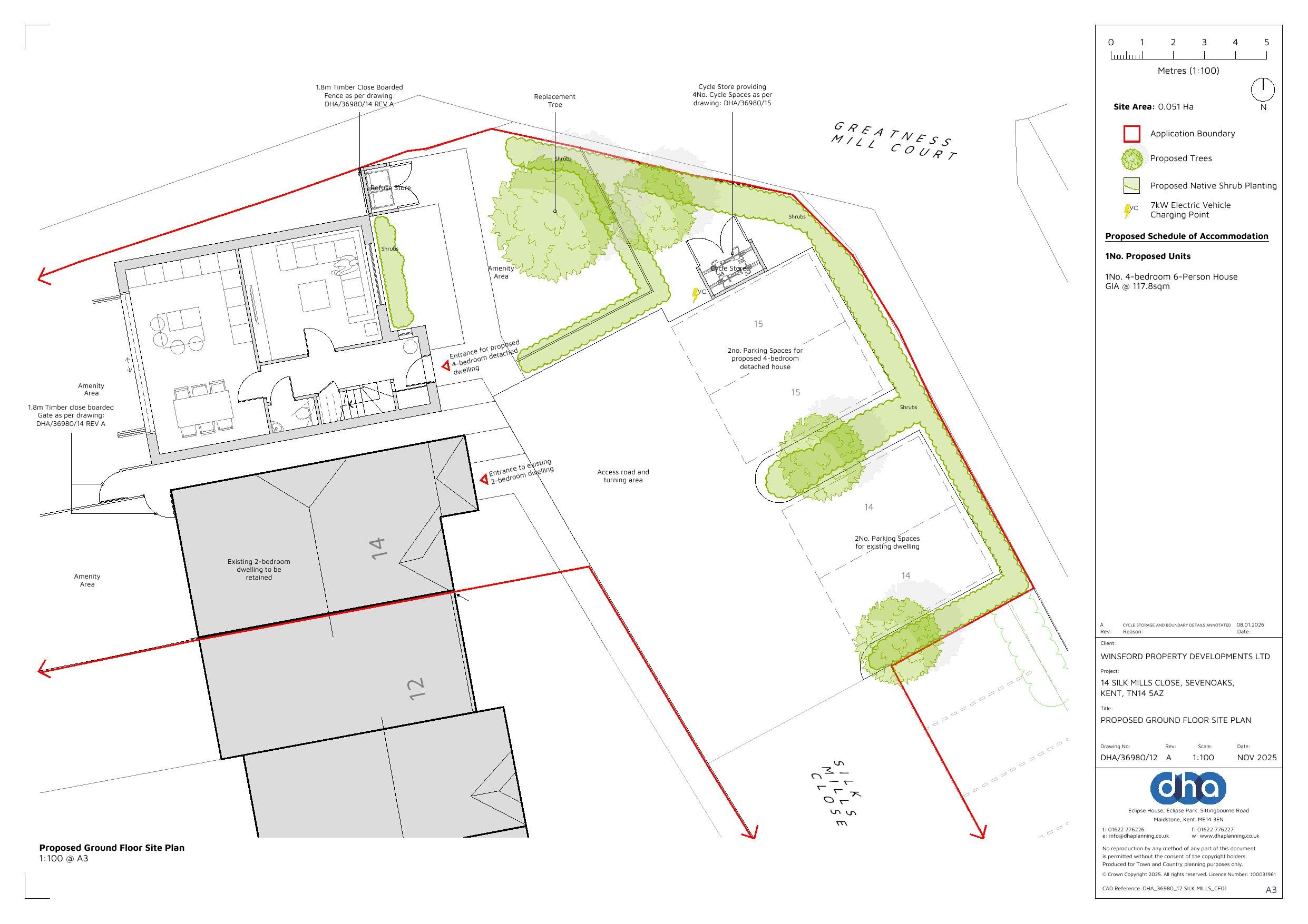 Erection of a detached dwelling with loft space and rooflight and creation of four associated parking spaces and associated landscaping. Cycle and refuse store. Timbers gates and fence. Electric charging point.