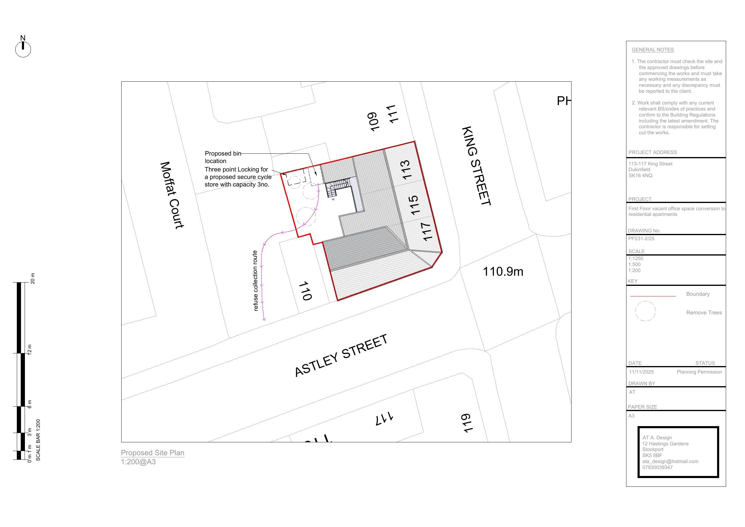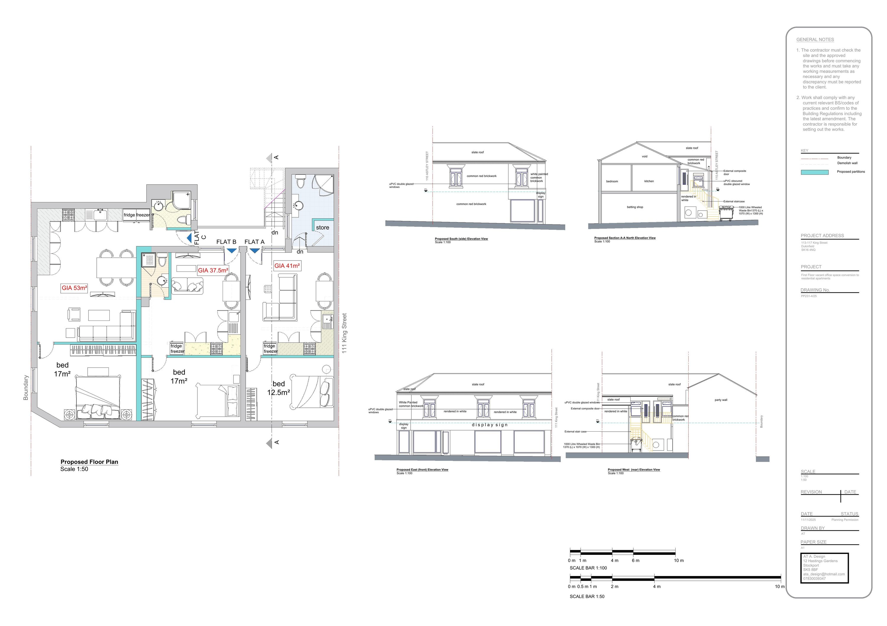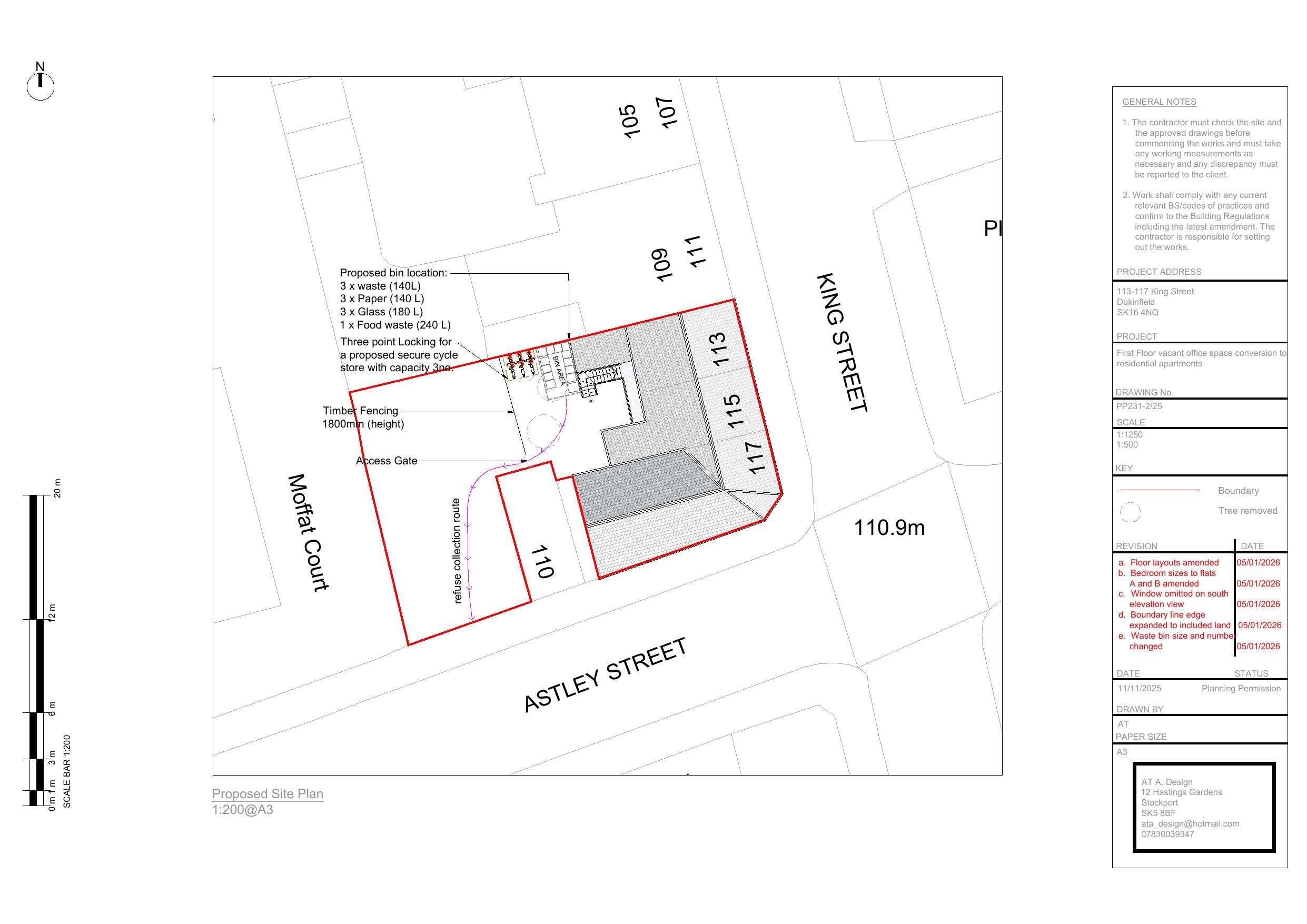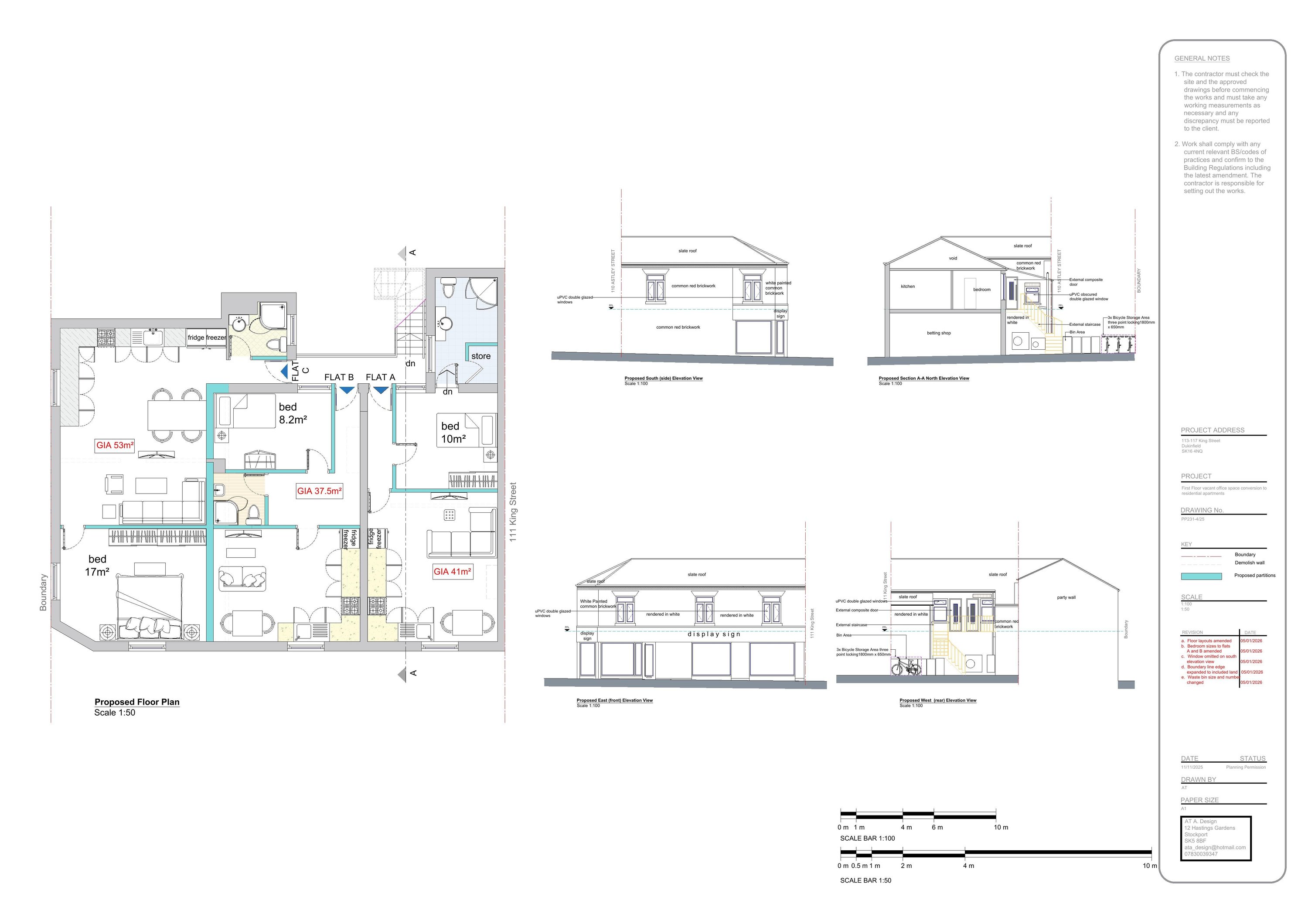 Change of use of first floor from offices (Use Class E) to 3 No. self-contained flats (Use Class C3) and external alterations (amended location plan received 8th January 2026).