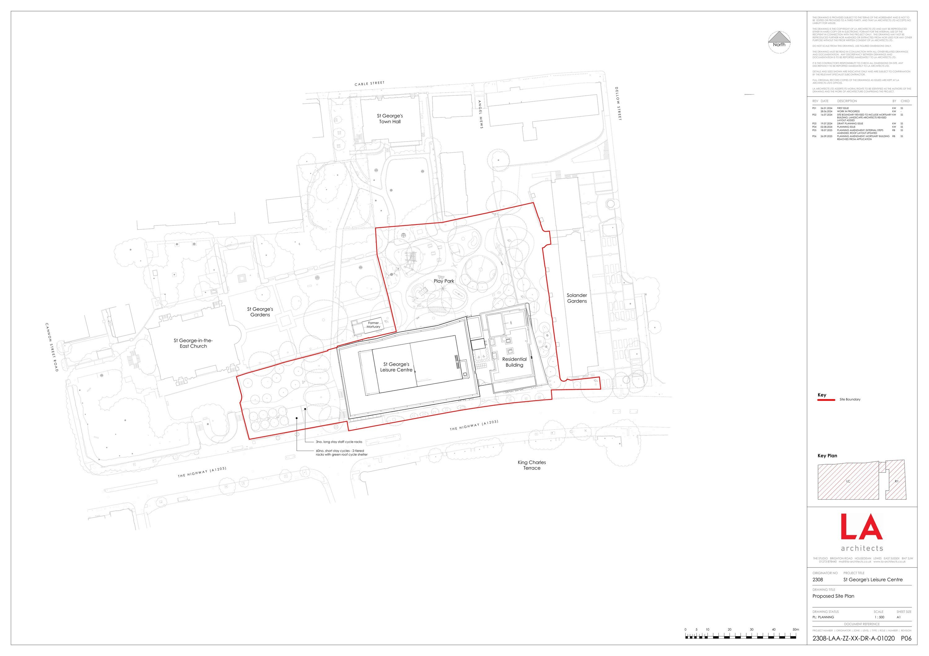 Demolition of the existing leisure centre building and other associated structures as part of a phased redevelopment of the site to include erection of a replacement leisure centre building with ancillary café use and external cycle parking; erection of a 9 storey residential building to provide 30 affordable homes; public realm improvements to St George's Gardens including landscaping and new and replacement play provision; shared accessible car parking and a servicing yard with access from The Highway and associated works; restoration of former mortuary building for flexible Use Class E; re-location of 52 headstones which have been previously re-located during the construction works for the existing St George's Leisure Centre, to be positioned against listed wall adjacent to Angel Mews.